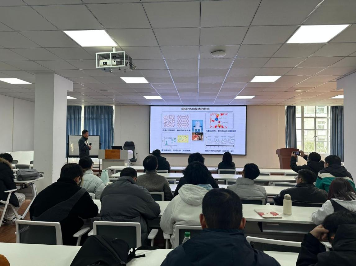 徐君研究员此次报告的题目为“分子筛催化中的固体核磁共振谱学:从活性位到反应机制”。徐君研究员主要介绍了通过低灵敏度金属核(Zn、Mo等)信号增强方法、分子间相互作用的多维谱以及原位固体NMR技术,研究了分子筛上的酸性位、协同活性位以及低碳分子的催化反应机制,为催化剂构-效关系建立提供了新的信息。报告会后,老师、学生踊跃提问,徐君研究员耐心解答,大家收获颇多。