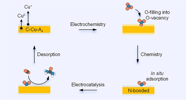 团队进一步通过新型电化学-化学循环策略,非晶态氧化铜包覆的晶态铜纳米线可实现0.89 mol h–1g–1的破纪录尿素产率。机理研究揭示了三步催化循环:电还原生成零价铜和氧空位;氧空位通过氧原子插入介导硝酸盐活化,自发产生氮键合亚硝酸盐(*NO2)同时将Cu0氧化为催化活性位点Cu+;Cu+催化*NO2与CO2间的碳氮偶联生成尿素分子。该路径规避了传统速率限制步骤的硝酸盐还原过程,将尿素合成的电子转移数从16e–降至12e–。值得注意的是,直接使用亚硝酸盐无法生成Cu+或氮键合中间体,反而形成氧键合物种并显著降低碳氮偶联活性,这一发现颠覆了传统认知。相关成果以题为“Achieving Record-Breaking Urea Synthesis on Crystalline-Amorphous Hybrid via Electrochemical-Chemical ”发表在国际顶级期刊《Journal of the American Chemical Society》上,yl9193永利集团严大峰副教授为共同第一作者。
