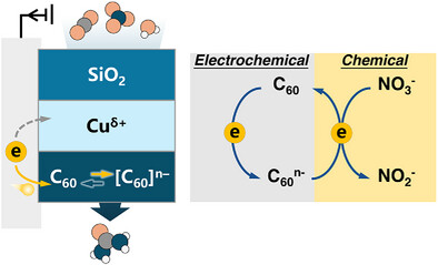 高效稳定的催化剂活性中心对促进电催化尿素合成至关重要。团队提出通过电化学步骤与化学步骤的耦合,利用富勒烯(C60)作为电化学还原过程中的氧化还原活性电子介质,有效抑制了带正电铜位点(Cuδ+)的不可逆还原失活。具有电子接收能力的富勒烯形成离子(C60n–),与硝酸根离子发生自发化学氧化还原反应,生成亚硝酸根离子并再生中性C60(C60n–+ NO3–→ C60+ NO2–)。该循环机制在优化整体反应路径的同时实现了电子传递闭环。尿素产率显著提升至385.9 mmol h−1g−1,并展现出长期稳定性。本成果以题为“Closing Electron Transfer Loop to Boost Electrocatalytic Urea Synthesis”发表在国际顶级期刊《Angewandte Chemie》上,yl9193永利集团严大峰副教授为共同通讯作者。