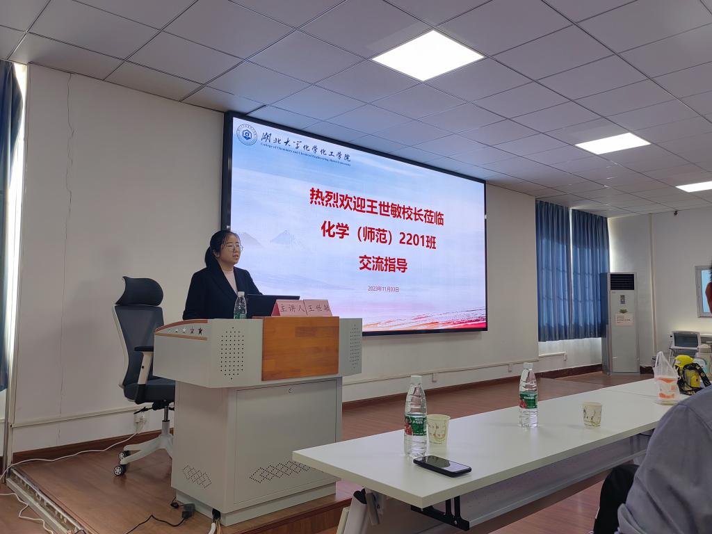 首先,王世敏校长从自身求学经历和教育教学经历出发,向同学们阐释化学专业具有良好的发展前景,鼓励同学们要对未来充满信心。随后,王世敏校长指出“材料是人类文明的物质基础,而化学是创造新物质的科学”,通过介绍材料科学的重要性、材料科学的内涵、材料的迭代更新与人类文明发展之间的关系,进一步强调“材料的进步引领人类社会发展”这一主题,并在此基础上向同学了普及了三次技术革命与工业革命相关知识。最后,班主任李玢洁再一次对王世敏校长的到来表示感谢,与同学们进行了友好互动,指出国家强大与人类发展息息相关。
