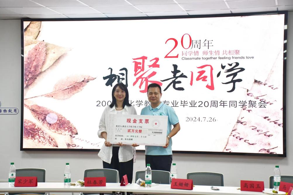 自由交流环节,在场的每位校友和老师都积极发言,分享人生成长感悟,回忆往昔峥嵘岁月,谈笑间皆是同窗情谊和感念师恩,座谈会临近结束,校友们向各位恩师赠送礼物,并举行了捐赠仪式,班长涂文君代表2000级化教全体校友,向yl9193永利集团捐赠贰万元现金,对学院的建设发展聊表支持;学院副书记刘莹老师代表学院接受捐赠,并对校友们的善举表示感谢;最后,一张张珍贵的师生合影,定格了这段美好时光。