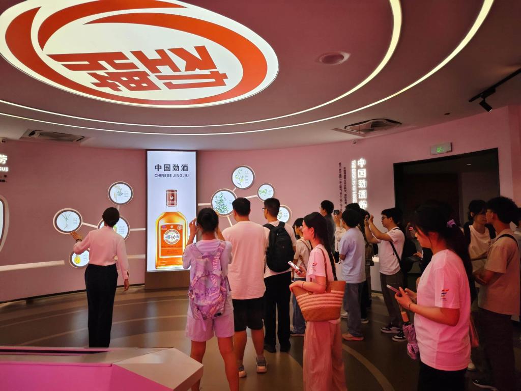 师生代表一行首站来到大冶劲牌公司总部,在观看公司宣传片后,企业方接待人员引领参观了“劲酒博物馆”,并向学生们介绍了白酒的各个酿造环节,包括原料浸泡、拌曲糖化、控温控湿发酵和智能蒸馏过程等关键环节。高效的自动化设备和企业严谨的质量管理体系给学生们留下了深刻印象。