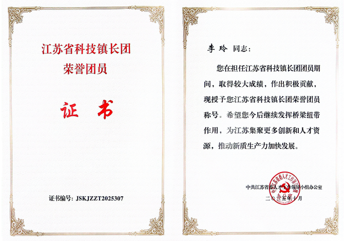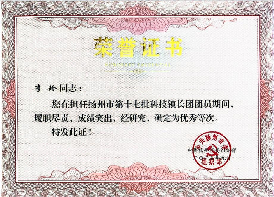 近日,我院副教授李玲,因在2023至2025年担任第十六、十七批科技镇长团团员期间表现突出,荣获“江苏省科技镇长团荣誉团员”称号,并在扬州市第十七批科技镇长团考核中获评“优秀”等次。