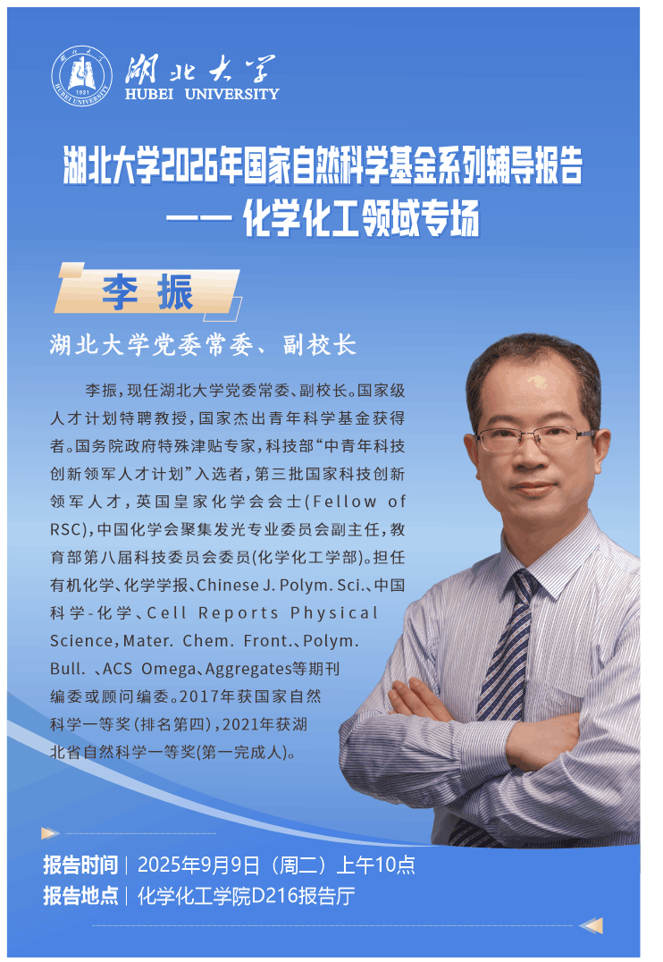 李振,现任永利集团党委常委、副校长。国家级人才计划特聘教授,国家杰出青年科学基金获得者。国务院政府特殊津贴专家,科技部“中青年科技创新领军人才计划”入选者,第三批国家科技创新领军人才,英国皇家化学会会士(Fellow ofRSC),中国化学会聚集发光专业委员会副主任,教育部第八届科技委员会委员(化学化工学部)。担任有机化学、化学学报、Chinese J.Polym.Sci.、中国科学-化学、Cell Reports PhysicalScience,Mater.Chem.Front.、Polym.Bull.、ACS omega、Aggregates等期刊编委或顾问编委。2017年获国家自然科学一等奖(排名第四),2021年获湖北省自然科学一等奖(第一完成人)。